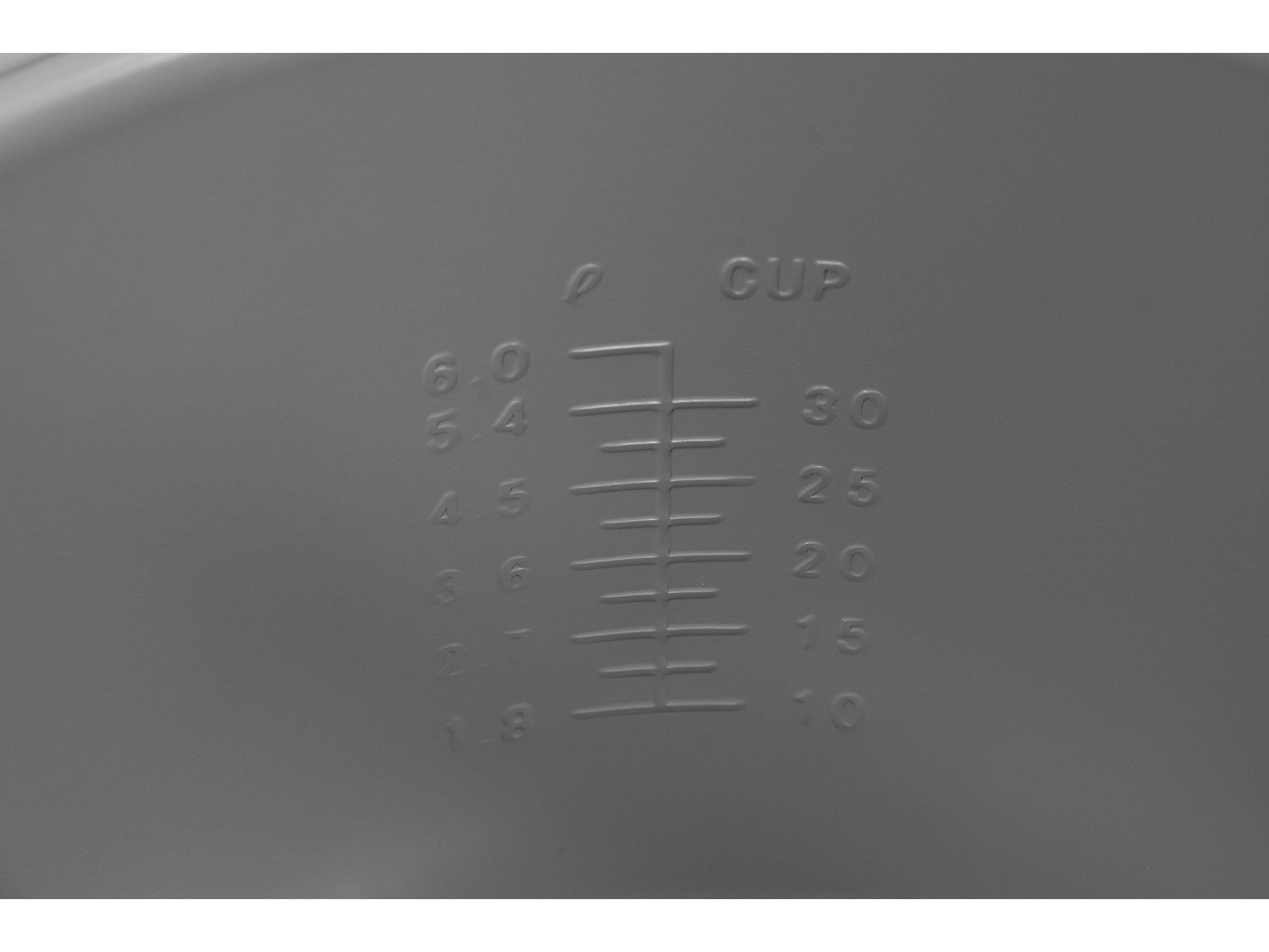Der Reistrichter mit einem Durchmesser von 320 mm und einer Höhe von 210 mm verfügt über eine eingeprägte Skala, so dass Sie die Reismenge im Auge behalten können. Außerdem ist seine Innenseite mit einer Antihaftbeschichtung versehen, die die Reinigung erleichtert und beschleunigt. Außerdem ist eine spezielle Silikonmatte im Lieferumfang enthalten, die verhindert, dass der Reis anbrennt und am Boden festklebt.